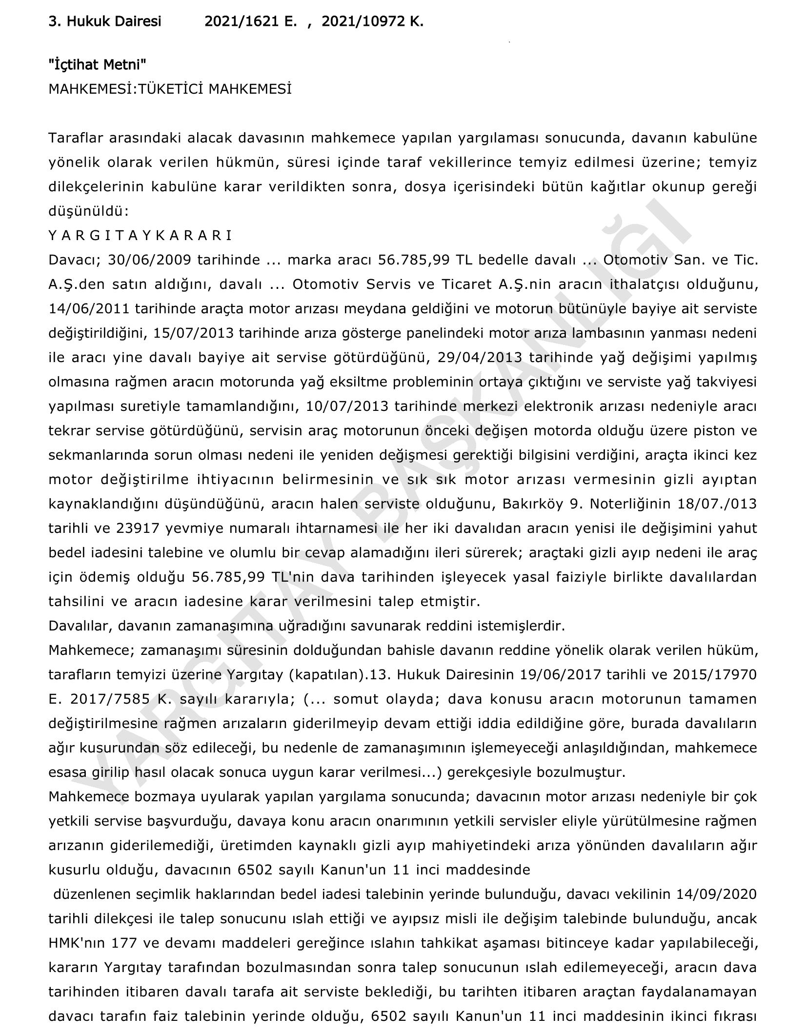 Aşağıdaki karar, bir tüketicinin sıfır kilometre olarak satın aldığı tarihin üzerinden henüz 2 yıl geçmeden arızalanması sebebiyle önce motoru yetkili servis tarafından değiştirilen daha sonra yağ eksiltme sorunu yaşanan bu sorunu ise yağ takviyesi ile giderilen daha sonra yeniden arıza veren ve yeniden motorunun değiştirilmesi gerektiği anlaşılan bir araç ile ilgidir.