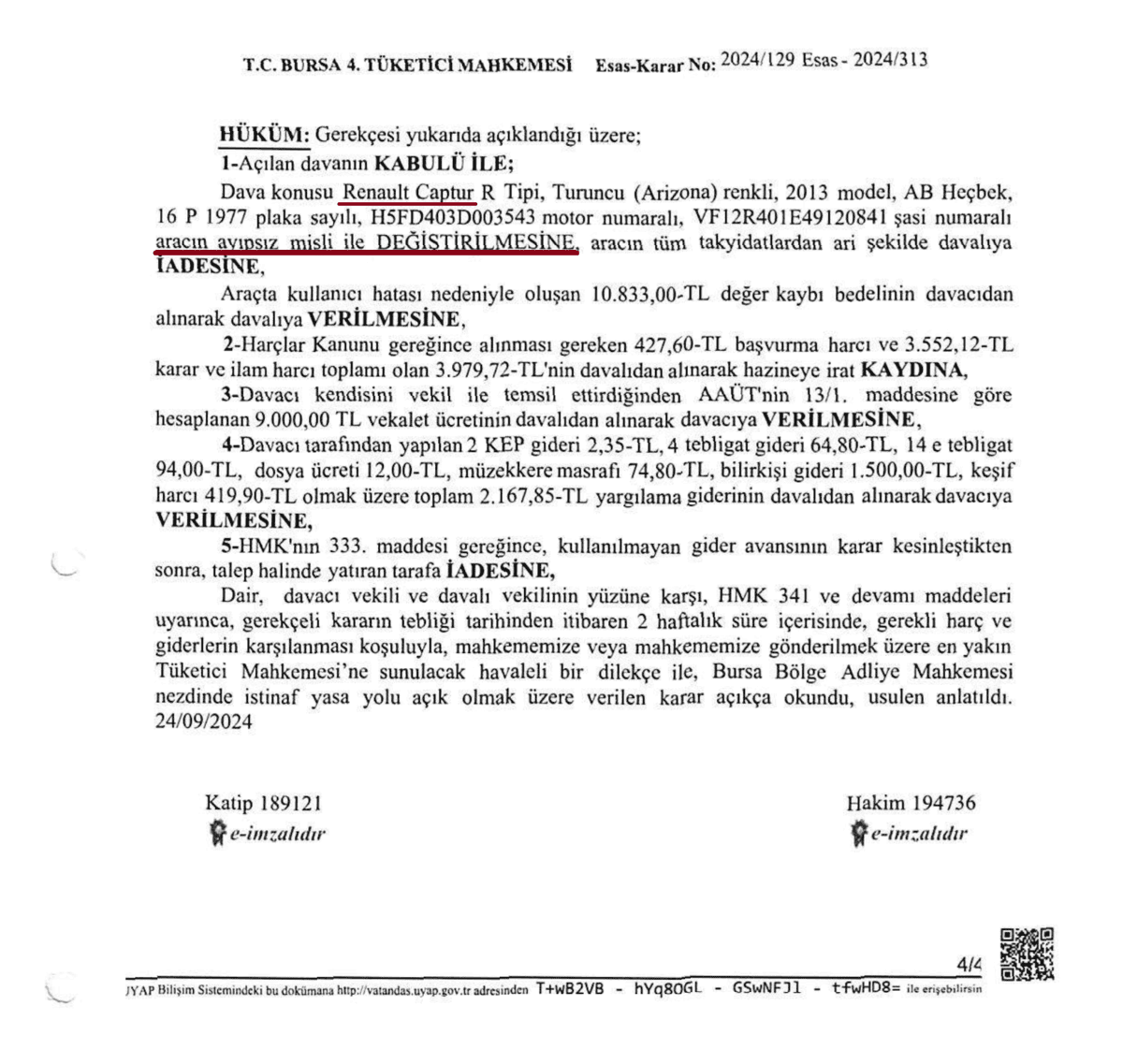 Bursa 4. Tüketici Mahkemesi, 2024/129 Esas, 2024/313 Karar sayılı ilamıyla davanın kabulüne ve aracın ayıpsız misli ile değiştirilmesine karar vermiştir. Davalı tarafın istinaf başvurusu da Bursa Bölge Adliye Mahkemesi 7. Hukuk Dairesi tarafından esastan reddedilmiş; böylece misliyle değişim hükmü icra takibine konu edilmiştir.