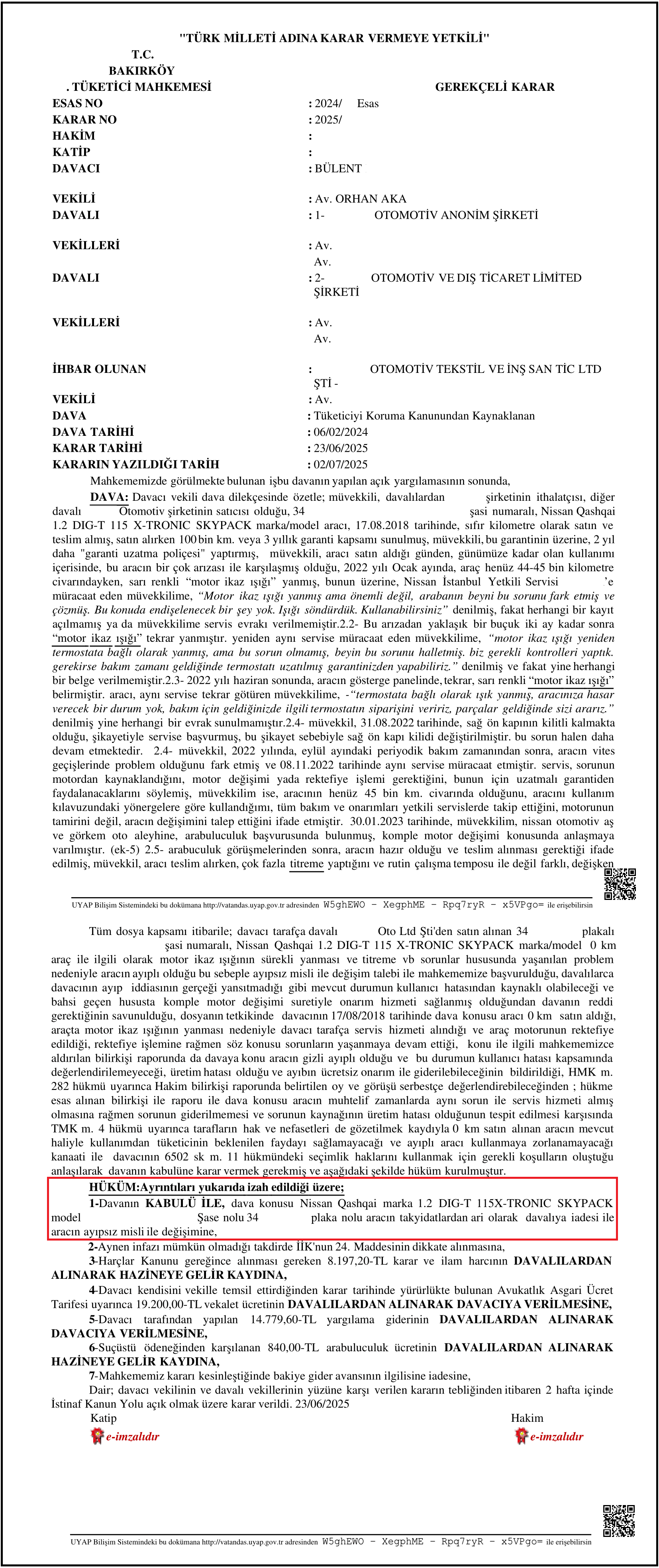 Sıfır Kilometre Araçta Satış Öncesi Gizlenen Ayıp ve Bitmeyen Arızalar Nedeniyle Misliyle Değişim Davası: Motor ve Şanzıman Parçaları