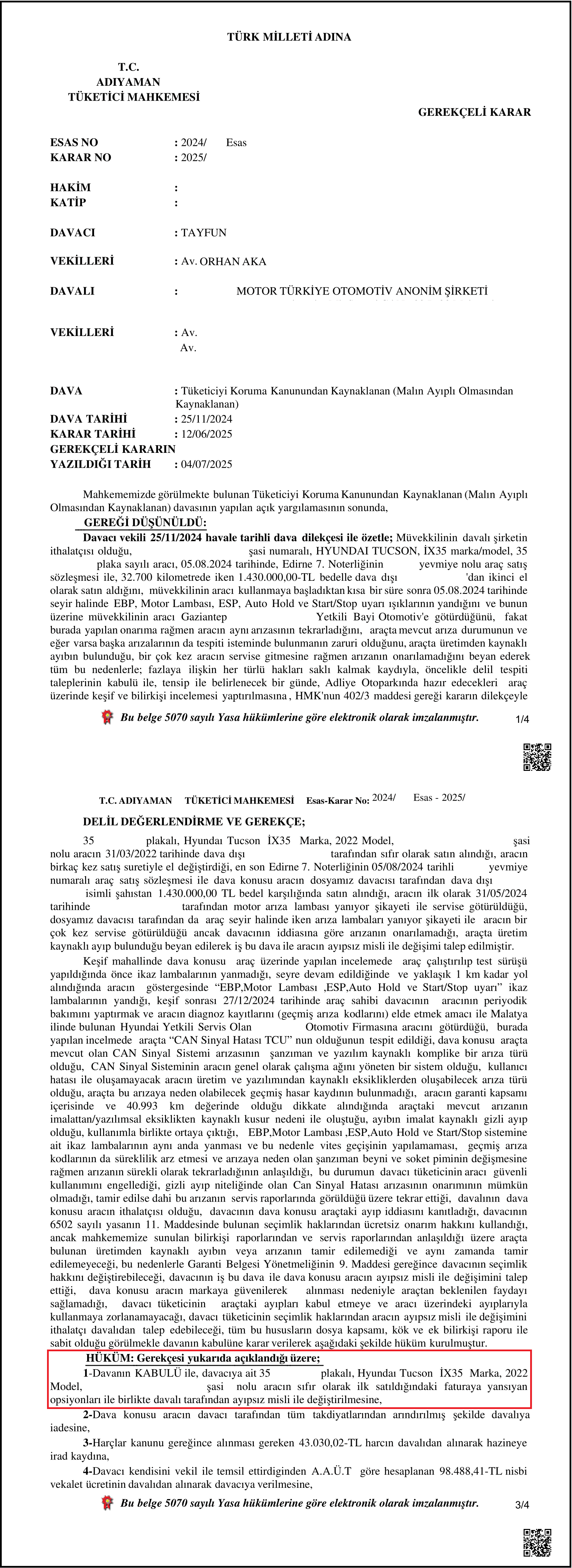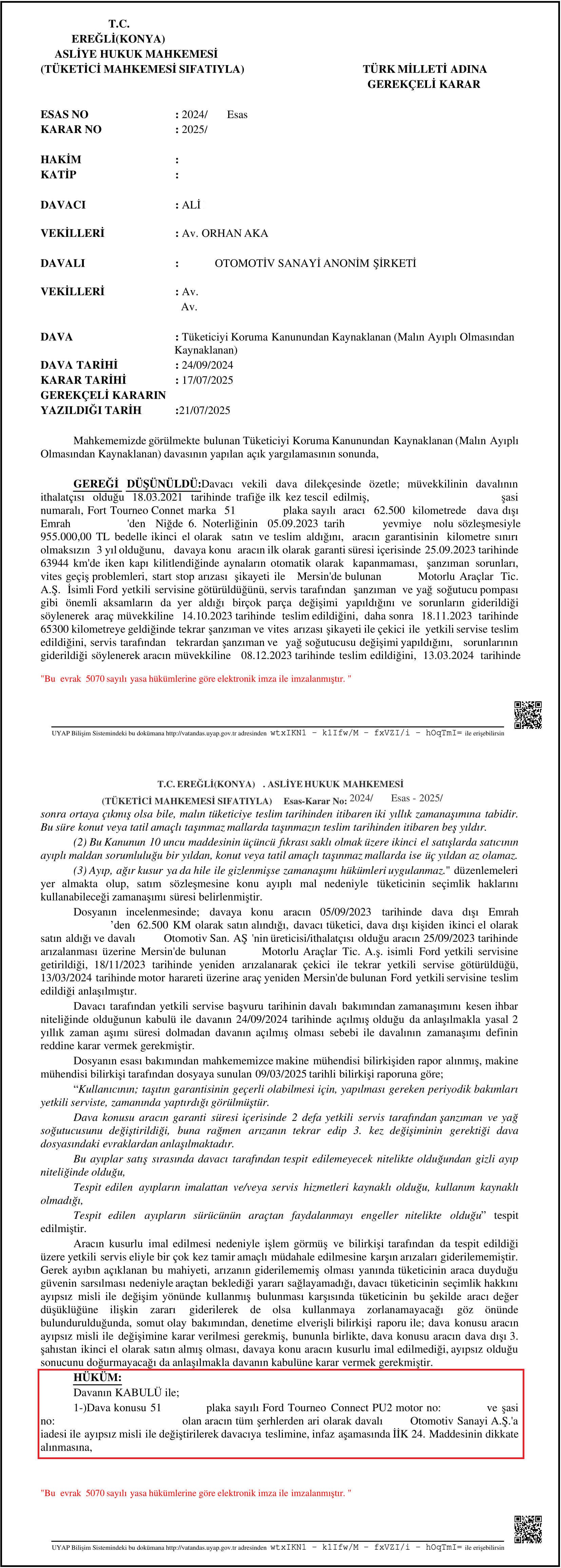 Araç 01.12.2023 tarihinde ilk tescil edilmiştir, tarafımdan ise 02.05.2025 tarihinde ikinci el olarak satın alınmıştır. Şu anda kilometresı 18.200 km’dir. Aracım garanti kapsamında olup, yaşanan arıza üretim kaynaklıdır.