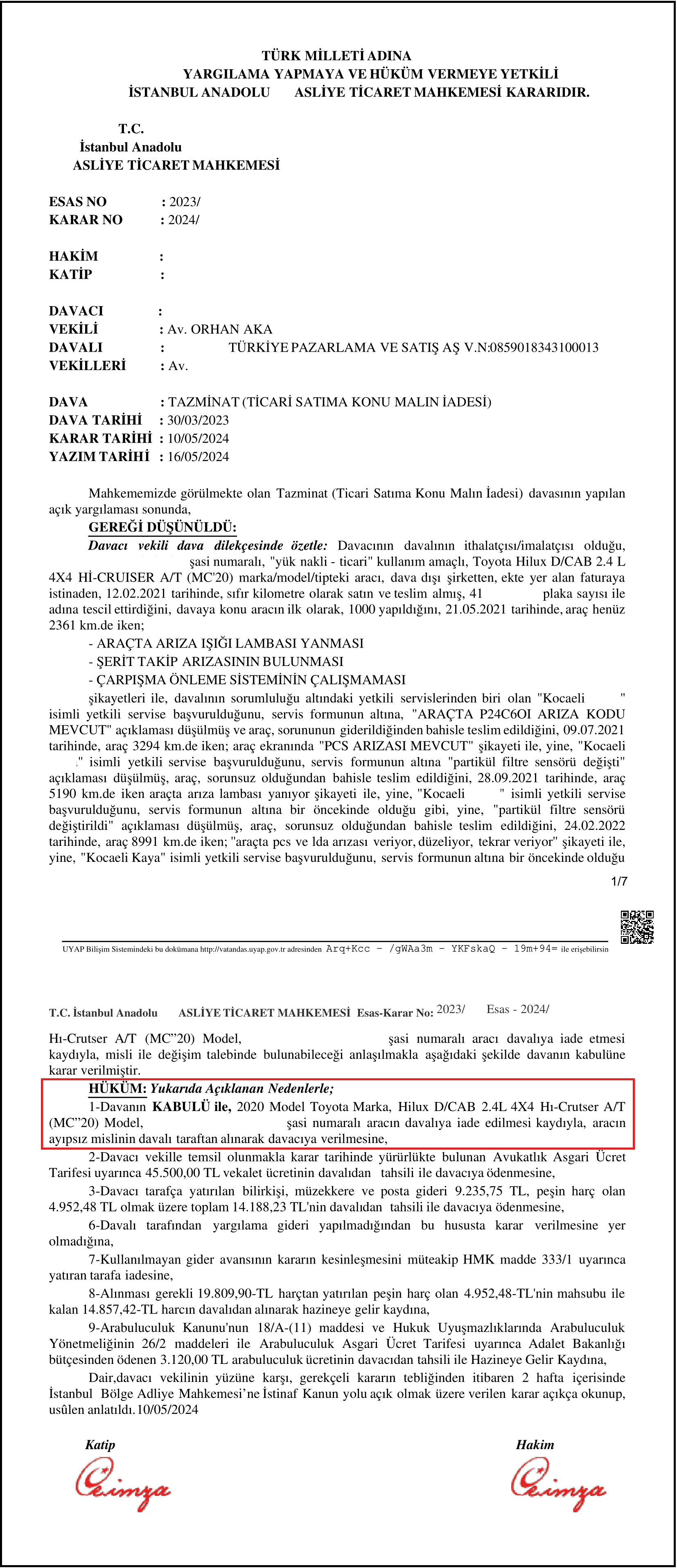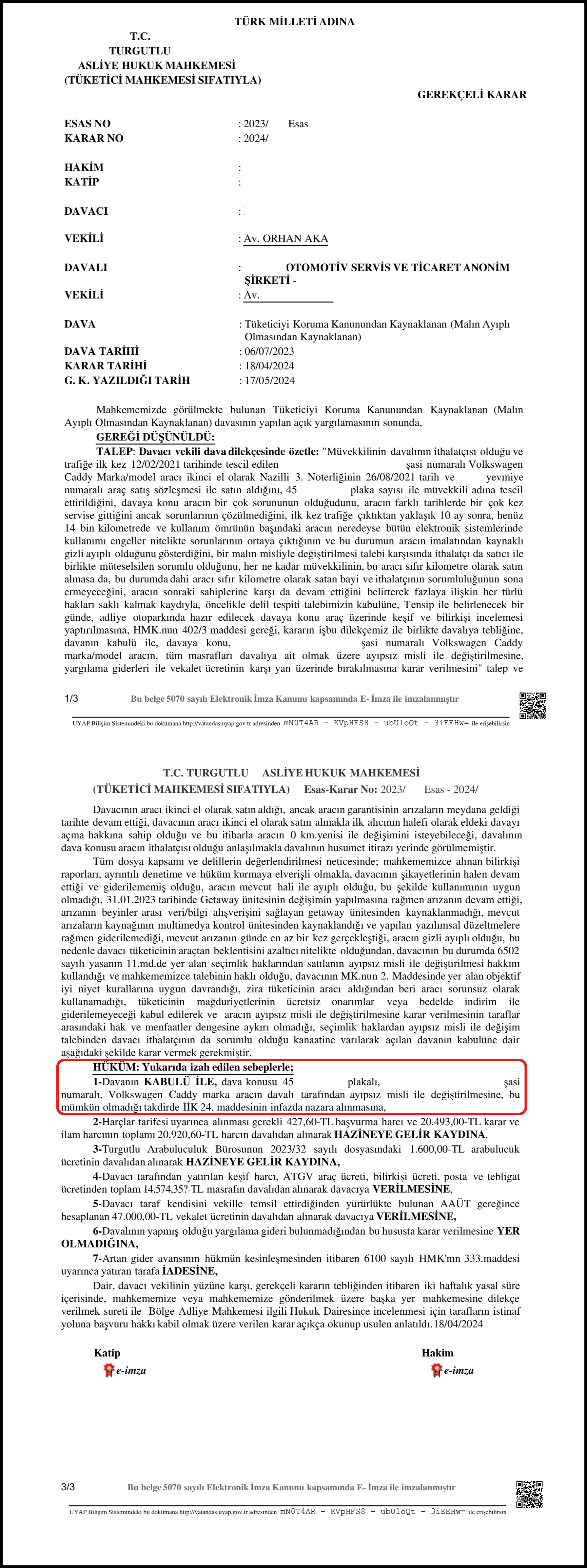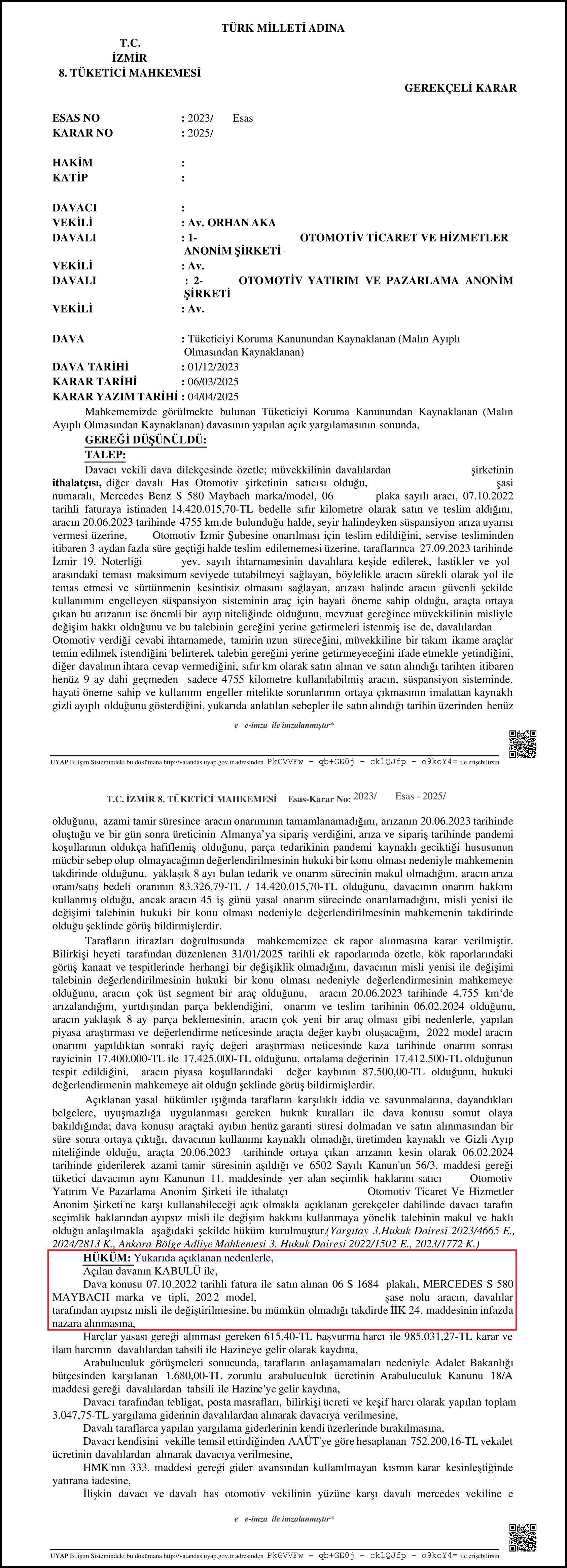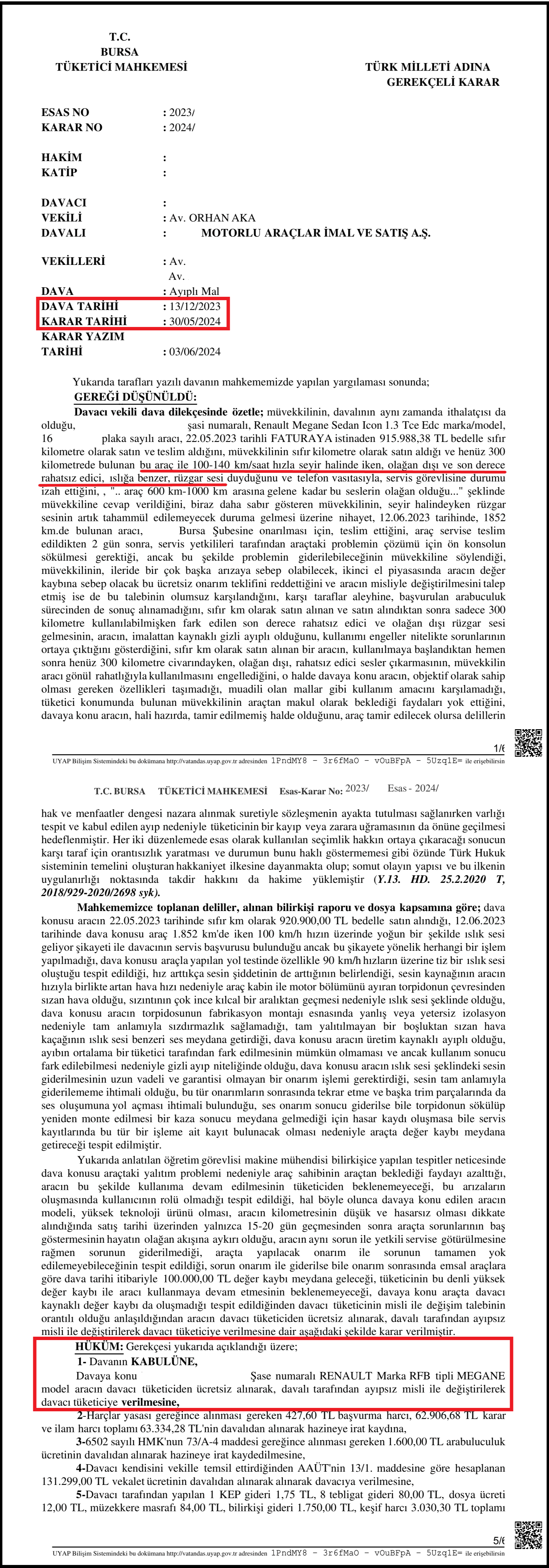 5. Merhaba 27/06/2024 tarihinde satın almış olduğum almadan önce gözle yüzeysel olarak inceledim ve birşey olmadığını düşünerek teslim aldım bu sıfır km aracı satmak istediğimde alıcı ile birlikte ekpertize gittik herhangi bir hata vs. olmadığını düşündüğüm aracın sağ ön çamurluğundan boya mikron değeri yüksek geldi çamurluğun görünmeyen kısmındaki vidaların boyalarının dökülmüş olduğu dolayısı ile sökme takma işlemi olduğunu anladık eksperden bu şekilde bir rapor alıp yetkisi serviste aracın incelenmesini talep ettik burda da aynı sorunla karşılaştık bu durum için misli ile değişim davası açılabilir mi avukat bey