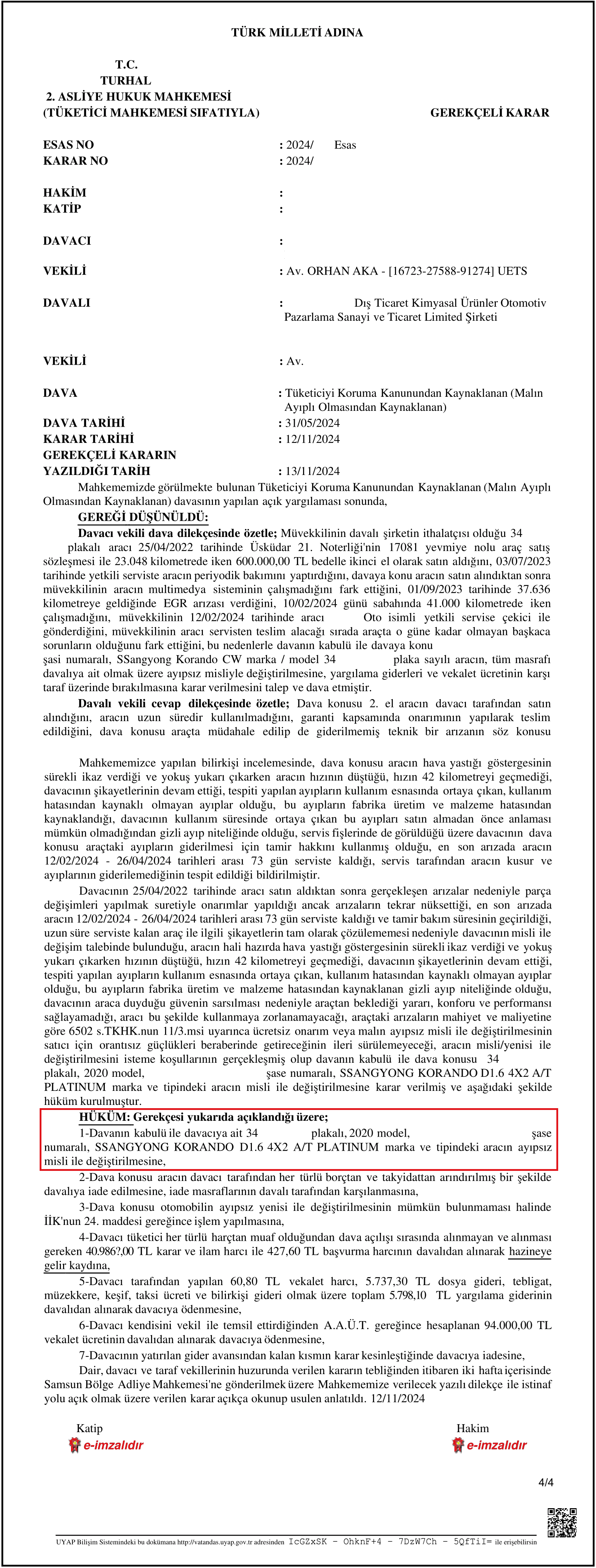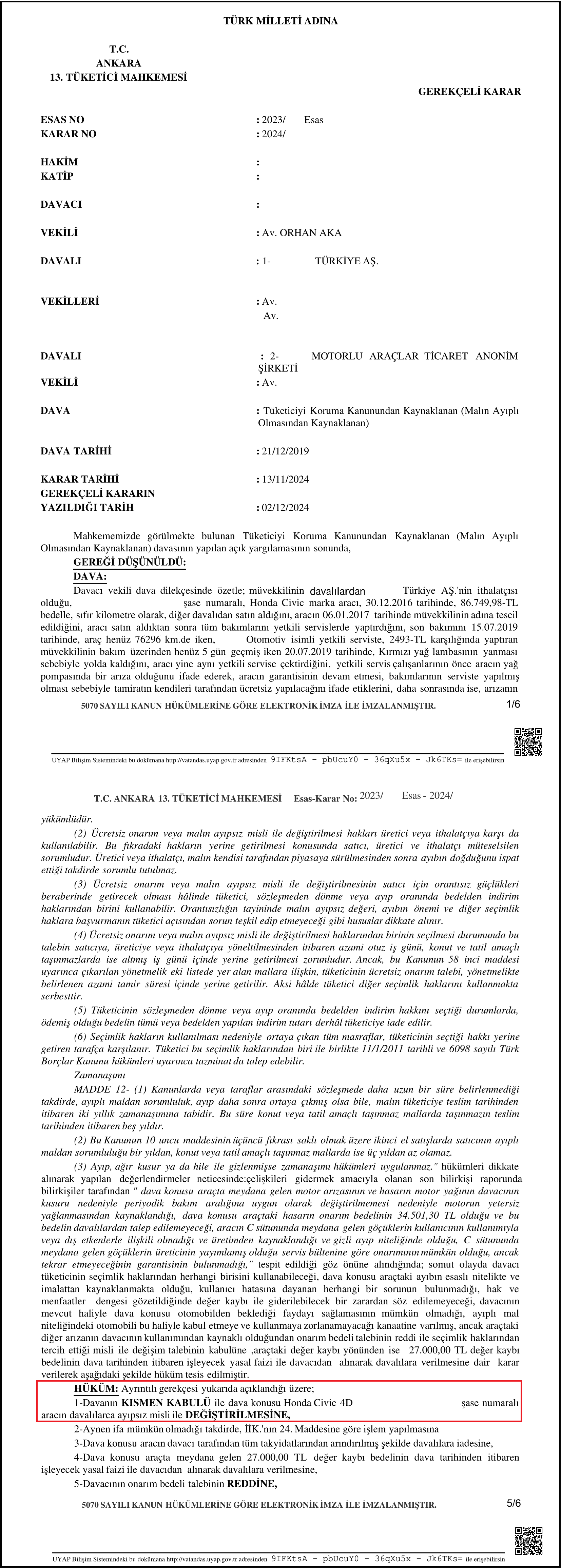 Sıfır Kilometre Araçta Satış Öncesi Gizlenen Ayıp ve Bitmeyen Arızalar Nedeniyle Misliyle Değişim Davası: Motor ve Şanzıman Parçaları