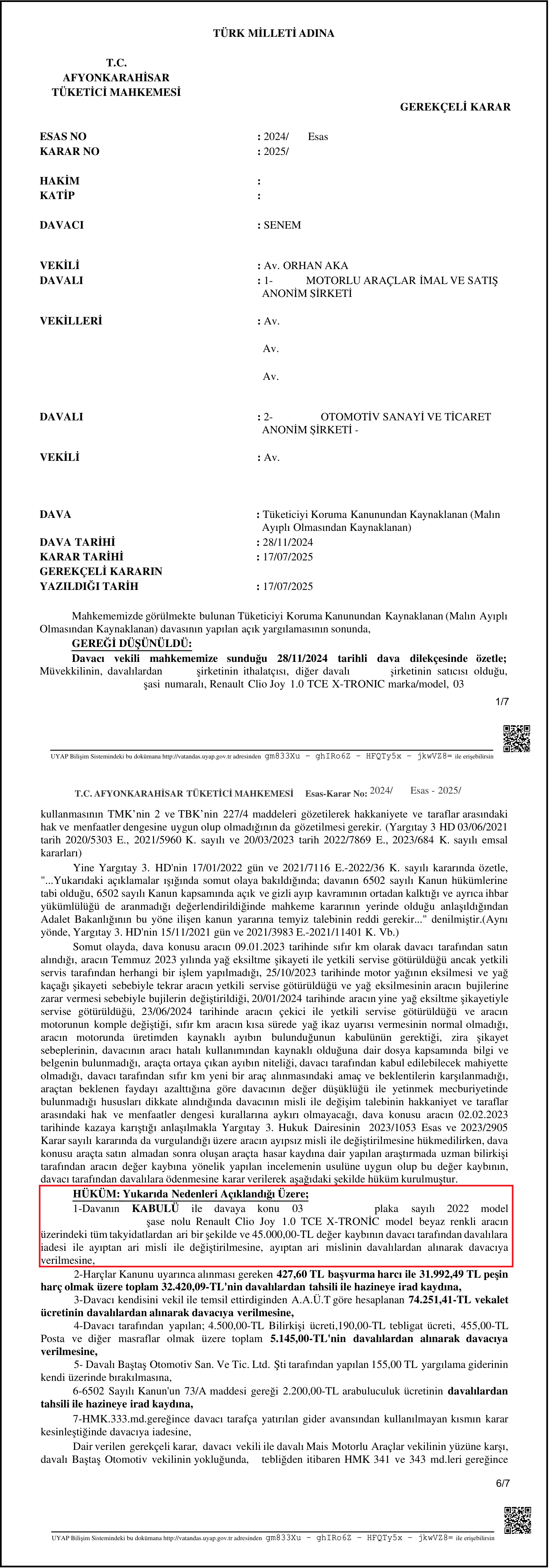 Sıfır Kilometre Araçta Tekrarlayan Motor (Partikül Filtresi ve Katalizör) Arızaları Nedeniyle Üretim Kaynaklı Gizli Ayıp Tespiti ve Misliyle Değişim Davası: